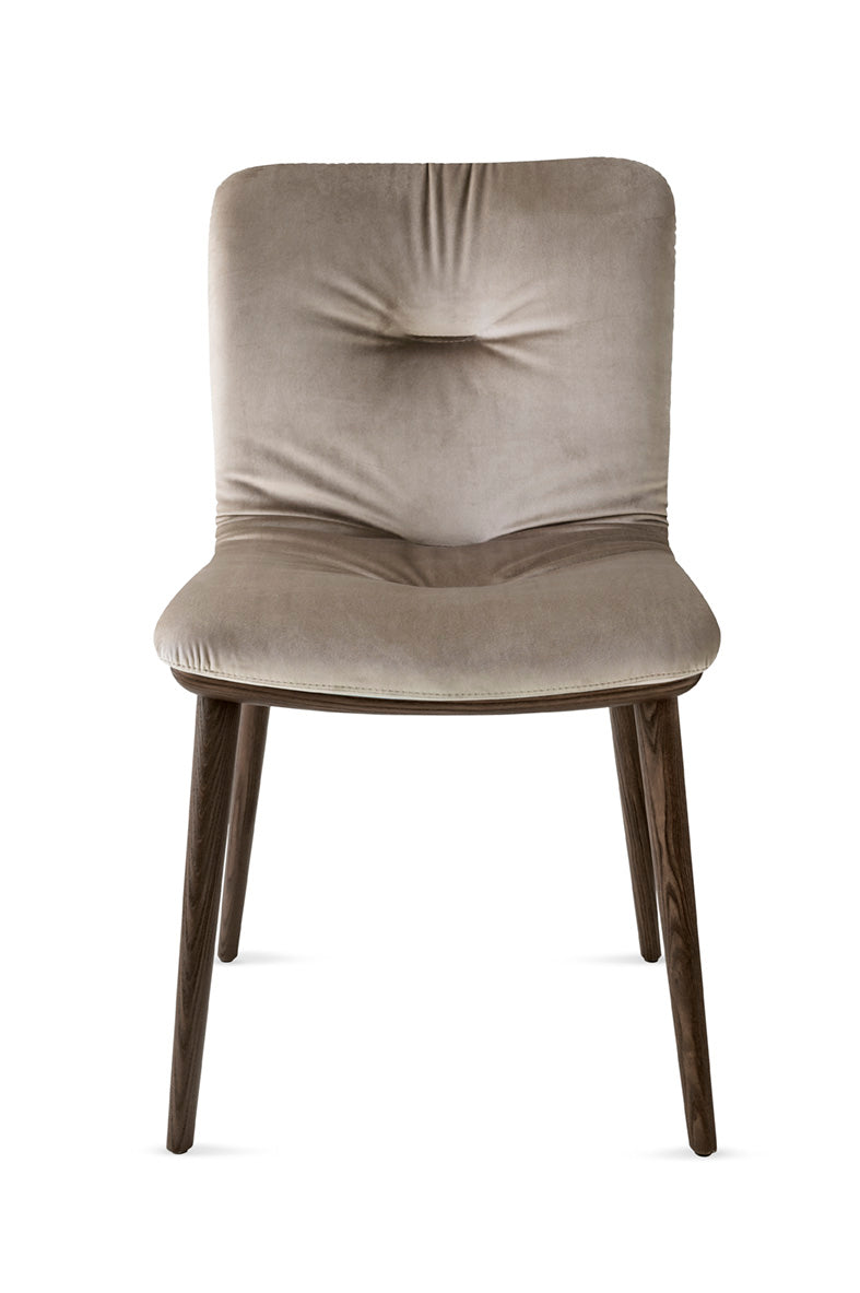 Den har en solid ramme i tre med fire elliptiske, koniske ben, mens det polstrede skallet er romslig, komfortabelt og trukket i kvalitetsmaterialer. Dette er versjonen med ekstra polstring i setet gir en enda mykere sitteopplevelse